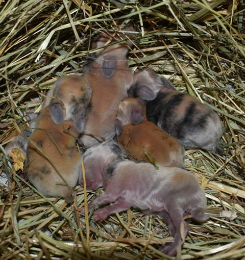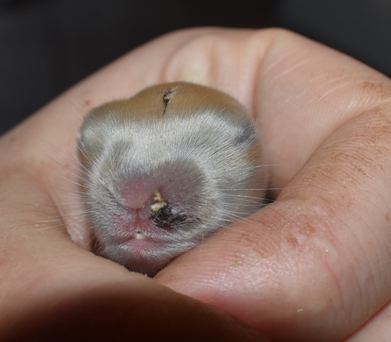 Die Mami mutiert inzwischen zu einer Löwenmutti, die mich attackiert wenn ich ihre Babys kontrolliere. Sie hat sich Fell gerupft und ein kuscheliges Nest gebaut und kümmert sich seit vorletzter Nacht ganz alleine um ihre Kleinen. Sie nehmen alle gut zu. Eine Wunde bei "Mops" gefällt mir nicht so richtig - alle anderen Wunden sind abgeheilt.