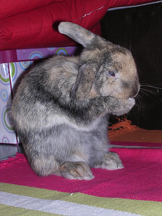 Leider ging es in 2012 mit meinen Krankheiten wieder los. Mir ging es mehrere Mal schlecht, ich hatte dann immer ganz doll Bauchweh. Mami und Papi sind dann immer sofort mit mir zum Arzt gefahren, manchmal auch nachts. Hinterher wurde dann immer was mit meine Zähnen gemacht, die wurden immer weniger! So ging es bis Anfang 2013 auch weiter. Blöd war, dass der Jerry mich dann immer nicht mochte. Der wollte wohl die Kaninchengruppe (Welche Gruppe, wir waren zu zweit?!?) beschützen und hat mich dann immer weggejagt. Ich musste dann immer in der Garderobe oder vor der Haustür wohnen. Das war erstmal nicht weiter schlimm: Mami und Papi haben mir da immer eine extra Toilette und extra Trinken und Essen hingestellt und dann ging das schon. War halt nur etwas einsam… Einmal hab ich 4 Wochen vor der Haustür gewohnt und Besuch musste immer durch die Garage reingehen. Aber ich hatte den Jerry trotzdem ganz schön lieb.