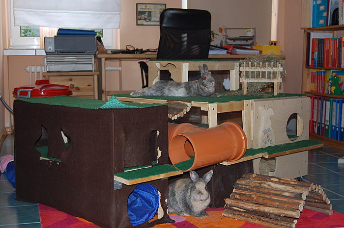 Beim zweiten Mal dann schon, wobei unsere neuen Eltern da etwas nachgeholfen und uns rausgehoben haben. Nachdem wir festgestellt hatten, wie toll es ist einfach herumzulaufen, wollten wir natürlich nicht mehr eingesperrt sein. Wir haben immer am Käfig gerüttelt.Nach 14 Tagen war es dann soweit: wir hatten unsere Eltern überzeugt, der Käfig sollte jetzt immer offen stehen und nur noch als Toilette dienen. An einem Sonntag wollte der Papi unser Zimmer kaninchensicher machen, was auch immer er damit meinte… Wir wurden schon morgens früh rausgelassen und Mami und Papi wollten noch frühstücken. Damit wir in der Zwischenzeit keinen Blödsinn machen (als ob wir sowas gemacht hätten!) hatte die Mami einen Wäscheständer vor den Schreibtisch gelegt und meinte, dass wir durch das Gitter nicht durchkommen. Herausforderung angenommen! Wo mein Kopf durchpasst, passe ich auch ganz durch! Ich hab dann erst mal den Schreibtisch etwas verschönert und mir ein paar Kabel näher angeguckt… natürlich nur von den Lautsprechern und so, keine 230V: ich bin ja nicht blöd! Gab aber trotzdem ganz schön Ärger hinterher…