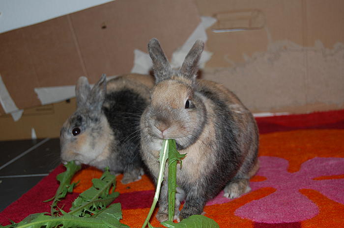 2013 wurde der Jerry dann auch mal krank, er hatte auch ganz doll Bauschmerzen, weil er sich überfressen hatte (der kleine Gierschlund!). Da hat der Jerry sich dann selbst von der „Gruppe“ abgesondert und sich alleine in die Garderobe gelegt. Weil ich das doof fand und ja weiß wie es ist, krank zu sein, bin ich einfach zu ihm gehoppelt und hab mich neben ihn gelegt! Danach durfte ich dann auch immer bei Jerry bleiben, wenn ich krank war.Jerry hatte verstanden, dass kranken Kaninchen bei uns nichts passiert, im Gegenteil!