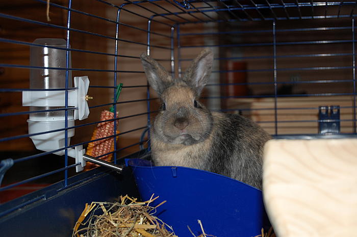 Als wir dann in unserem neuen zuhause ankamen, mussten wir wieder in einen Käfig! Wir sollten in dem Käfig bleiben und immer Abends für kurze Zeit und an den Wochenenden raus. Man muss sagen, dass sich unsere neuen Eltern noch nicht wirklich gut mit Kaninchen auskannten… Jerry und mir war das Anfangs (in den ersten beiden Tagen) relativ egal: wir kannten nur Käfig und die neue Umgebung hat uns auch etwas Angst gemacht. Als dann das erste Mal das Gitter vom Käfig weggenommen wurde, haben wir uns gar nicht raus getraut!