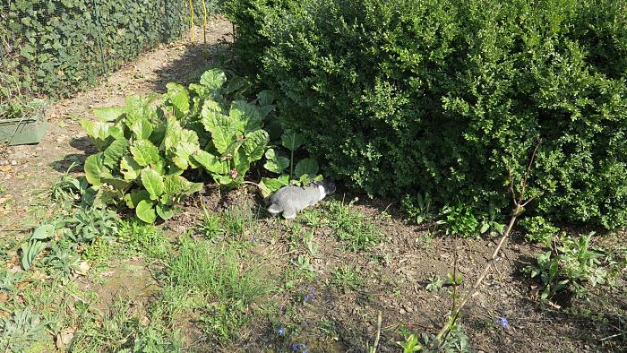 Immerhin ist Jean-Claude ja noch so nett und liegt nur zwischen den Stockrosen (sind doch welche, oder?) und die haben noch alle Blätter.