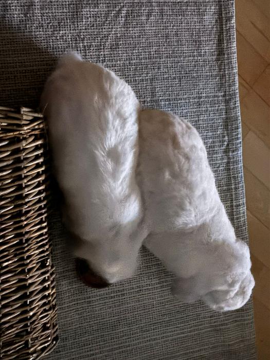 Heute war wiederwöchentlicher Großputztag! Ich hab dann alle Häuschen auf eine Seite gestellt, und erst die Teppiche abgefegt, abgesaugt, aus geschüttelt, und vor die Waschmaschine gelegt. Anschließend das übliche fegen, wischen, trocknen lassen. Natürlich toben Bunny und Aymee dann durch die übereinander gestapelten Häuschen. Jeder Schritt wird dann einzeln durch Bunny kontrolliert. Die meisten von euch kennen das. Als dann alles wieder stand, musste Amy getropft werden. Beide waren natürlich unter unterschiedlichen Häuschen, denn man muss erst mal sehen, was da los ist. Was soll ich sagen? Ich bin dann erst mal dem falschen weißen hinterher gelaufen. Ich wunderte mich schon, warum Aymee nicht wie immer einfach sitzen bleibt. War gar nicht Aymee!